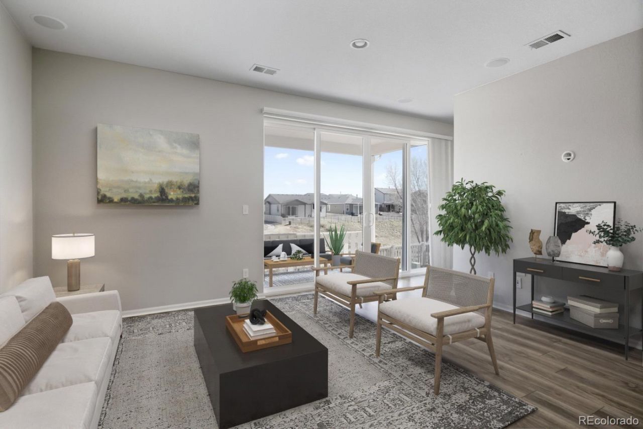 Charming and spacious ranch-style home in desirable Belle Creek, offering easy one-level living and modern comfort. Built in 2019 with a brand new roof and well maintained, this home features a bright, open-concept layout ideal for everyday living and entertaining. The sun-filled kitchen boasts a large island, stainless steel appliances, and ample cabinet space, seamlessly flowing into the dining and living areas. A large sliding glass door extends the living space outdoors to a generous concrete patio?partially covered?perfect for entertaining or relaxing.The primary suite offers a peaceful retreat with a walk-in closet and private bath complete with dual sinks and a walk-in shower. Two additional bedrooms and a full hall bath provide flexibility for guests, family, or a home office.Enjoy outdoor living on the covered front porch or unwind on the private backyard patio with low-maintenance landscaping. Ideally located just steps from the Belle Creek Family Center, parks, playgrounds, local coffee shop, and community events. Convenient access to Denver, DIA, and major highways. Move-in ready and full of charm. Floorplan in docs.