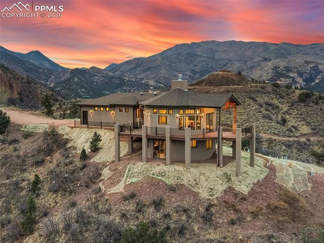 Perfectly Nestled in the hills of Crystal Park, an exclusive guard-gated community overlooking Colorado Springs and Garden of the Gods, this brand-new stucco rancher offers luxury living with unmatched views. Featuring 4 bedrooms, 3 bathrooms, and a heated 3-car garage, this home is thoughtfully designed with top-of-the-line finishes throughout. The main level boasts soaring ceilings, expansive windows showcasing stunning city and rock formation views, and a seamless open layout. The gourmet kitchen is equipped with a gas range, stainless steel refrigerator, granite countertops, and luxury vinyl flooring, while a striking double-sided wood fireplace elegantly separates the kitchen and living room. The spacious primary suite is a true retreat, complemented by an additional main-level bedroom or office. Step outside to the wraparound deck and take in breathtaking panoramic views of the entire city and Garden of the Gods. The finished basement offers incredible versatility with two additional bedrooms, a Jack-and-Jill bath, second laundry, and a kitchenette—perfect for guests or multigenerational living. Additional highlights include a brand-new well and septic system, water purification system, and a large 30x19 easily accessible crawl space for storage. The HOA maintains roads and provides snow removal all the way to the property, ensuring year-round accessibility. This is Colorado living at its finest—luxury, privacy, and spectacular views all in one exceptional home and only 1.2 miles from the Gate!
