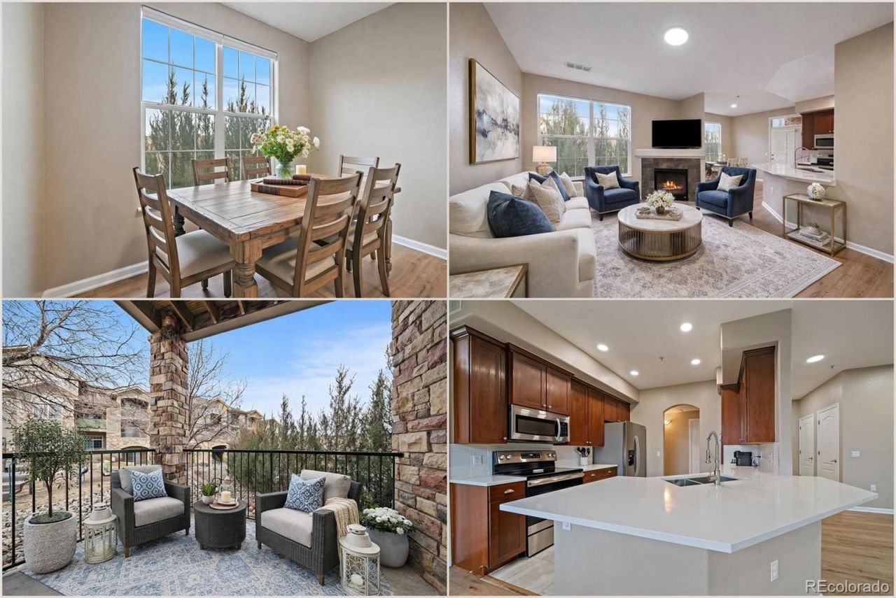 Some condos offer convenience. This one offers a lifestyle.Tucked into the most coveted corner of Hunters Chase, this main-floor retreat feels nothing like a condo ? private tree-lined patios replace parking lot views, and the only neighbors youll notice are the birds. No stairs, no hassle, just effortless single-level living with a covered entrance and your parking spot just steps from the front door.Step inside and the space opens up around you. High ceilings draw your eye upward while oversized windows flood the room with natural light. The fireplace anchors the living area, warm and inviting, flowing seamlessly into a kitchen built for people who actually cook ? quartz countertops, stainless steel appliances, a pantry, extended counter space, stone tile floors, and cherry cabinetry (or white, if you prefer ? seller credit available).Both bedrooms are generously sized. The primary suite features a glass-enclosed shower and room to breathe. A full-size washer and dryer with hanging racks, updated lighting, and a newer dishwasher round out the details that make daily life quietly better.Outside, Cherry Creek Trail, Stroh Ranch parks, a pool, playground, and soccer fields are minutes away. So are DTC, Castle Rock, Parker, and Downtown Denver.Home warranty for peace of mind included covering appliances and more. Low HOA covers water, sewer, trash, and insurance. FHA Warrantable for easy financing. Move-in ready ? no construction wait, no compromises.