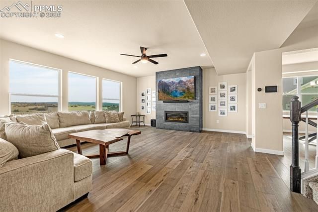 5TH BEDROOM CAN BE ADDED!! A stunning, LIKE-NEW, home in the highly sought-after Flying Horse community! This immaculate 4-bedroom, 5-bathroom residence offers exceptional craftsmanship, thoughtful upgrades, and breathtaking views of both the city and Black Forest. From the moment you arrive, you’ll be captivated by the home’s majestic white stucco exterior, fully landscaped front and back yards, and undeniable curb appeal. Step inside to discover an open, light-filled layout featuring LVP flooring throughout the main level, a dedicated office, and a separate dining area perfect for entertaining. The family room showcases a sleek black stone-accented gas fireplace, creating a warm and modern focal point. The gourmet kitchen is a chef’s dream, complete with granite countertops, stylish cabinetry, and premium finishes. A glass slider off the dining nook opens to the expansive back deck, where you’ll enjoy panoramic views of the Black Forest and city lights. Upstairs, you’ll find three spacious bedrooms and a loft that has been extended an additional 10 feet—a rare and versatile upgrade ideal for a lounge or play space. The primary suite serves as a private retreat, featuring a spa-like en suite bathroom with an oversized walk-in shower and modern touches throughout. The walk-out basement is built for both relaxation and recreation, boasting a massive rec room, a full wet bar with striking black leathered granite countertops, and a guest bedroom with an attached bathroom. Step outside to the backyard oasis, complete with a large basketball court that doubles as a multi-purpose activity area—perfect for gatherings, sports, or enjoying Colorado’s sunshine. Located in one of Colorado Springs’ premier neighborhoods, this home offers luxury, lifestyle, and location all in one. Don’t miss your opportunity to experience Flying Horse living at its finest!
