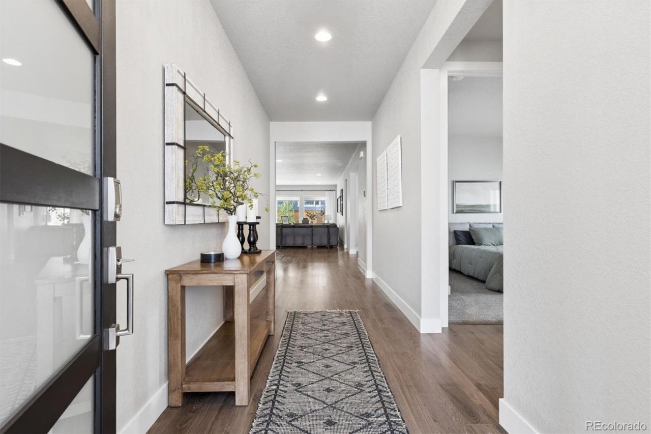 Experience modern luxury in this stunning Castle Pines residence, meticulously updated with premium finishes and a bright, airy floor plan. The heartbeat of the home is the chef-inspired kitchen, featuring sleek Quartz countertops, a 36-inch gas cooktop, a massive oversized island with seating, and soft-close cabinetry with custom pull-out shelving. High-end details abound, including a large single-bay undermount sink, designer pendant lighting, and a spacious walk-in pantry. The expansive living area is anchored by a contemporary stacked-stone gas fireplace with a custom wood mantle, framed by large windows that flood the space with natural light. Beautiful wide-plank flooring flows throughout the main level, leading to a dedicated mudroom and a convenient laundry room (washer/dryer are negotiable). The primary suite is a true retreat, featuring a spa-like bath with an upgraded luxury glass shower door. For those seeking more space, the full unfinished basement offers a massive blank canvas for a home theater, gym, or guest suite. Outdoor living is redefined with a professionally landscaped yard, full irrigation, and expanded concrete on the front porch. The private backyard oasis features a covered patio and a built-in gas fire pit, perfect for enjoying Colorado sunsets. Ideally located with easy access to I-25, you are minutes from the Denver Tech Center, local trails, and premier golf clubs. Enjoy proximity to the shops at Castle Pines, Elk Ridge Park, and top-rated Douglas County Schools. This move-in-ready gem includes an updated AC system and durable window well covers.